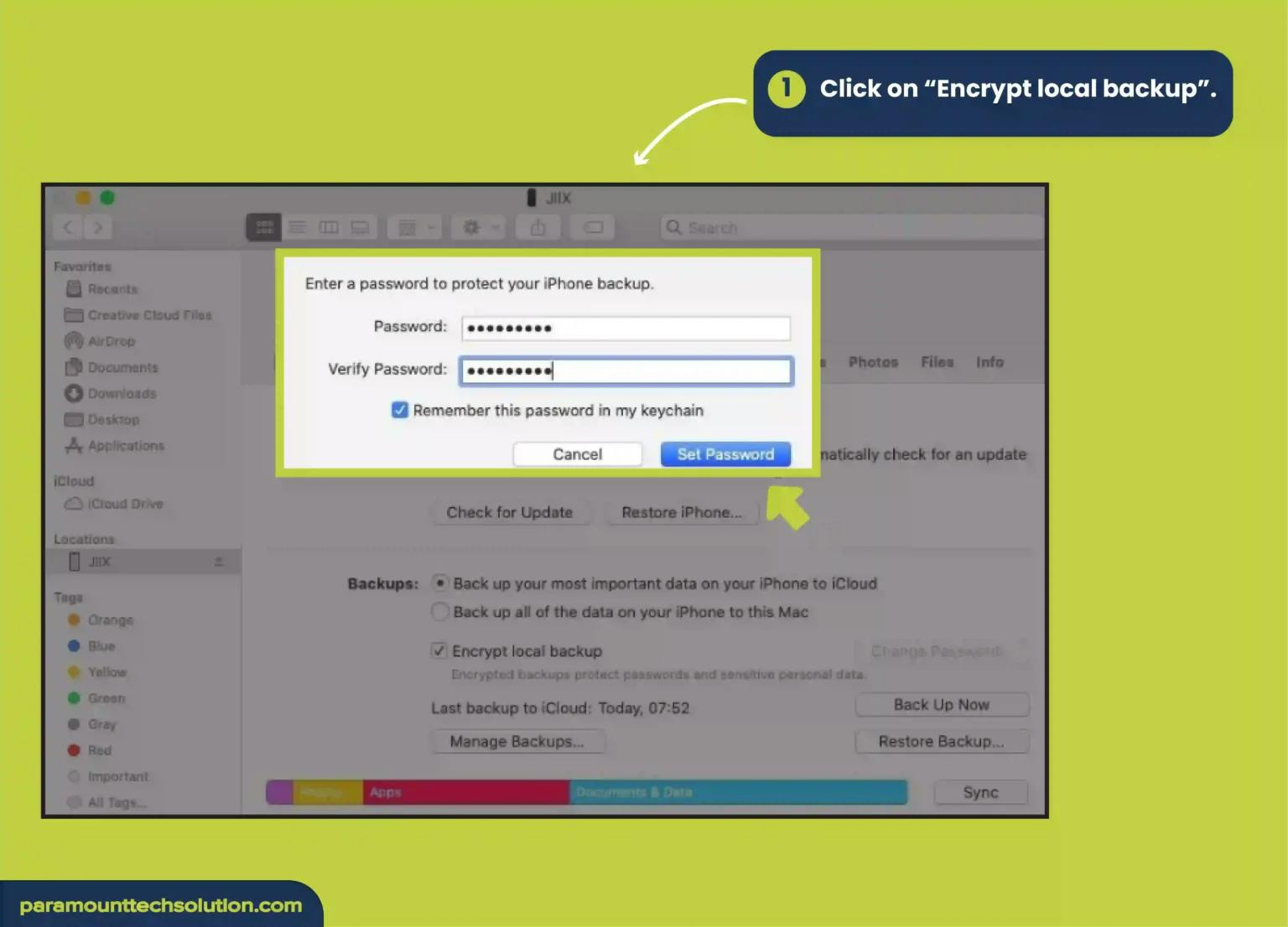6.If you wish to set up an encrypted password, click on the “Encrypt local backup” option, then type a password, and click “Set Password”. This creates an iTunes encrypted backup password.